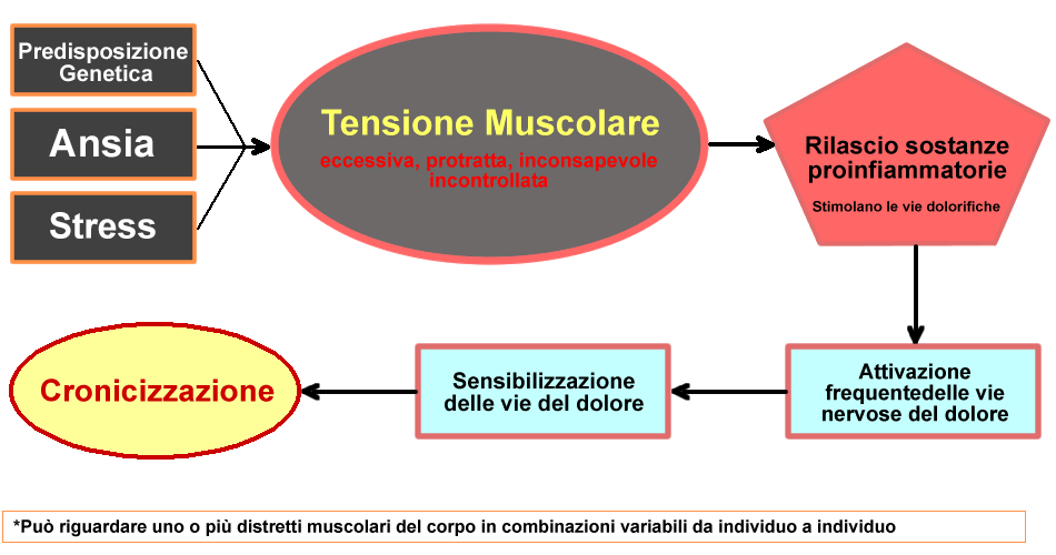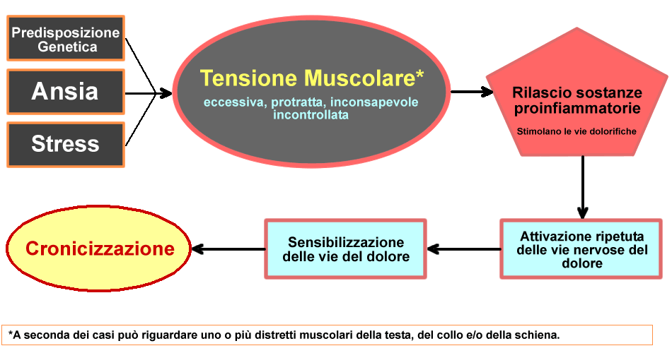 2 - TENSIONE MUSCOLARE eccessiva, inconsapevole,persistente o eccessivamente frequente di alcuni muscoli della testa (fronte, tempie, mandibola), del collo, delle spalle e del trapezio (in combinazione variabile da individuo a individuo): essa è quasi sempre una somatizzazione aggravata (pazienti cronici) o innescata da stati psicofisiologici legati a condizioni di stress spesso non riconosciute o sottovalutate (fattori cognitivi, emozionali e situazionali).
