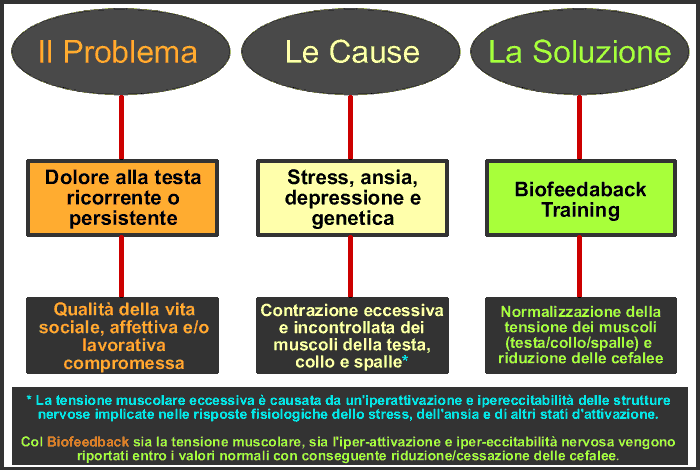 Il biofeedback è un metodo d'intervento psicofisiologico che, grazie all'uso di biosensori e tecnologie avanzate, permette l'acquisizione del controllo volontario delle tensioni muscolari (nuca, collo, trapezio, fronte, tempie e mandibola, in mix variabili) che causano e alimentano la cefalea di tipo tensivo, in tutte le situazioni di vita attiva (lavoro, relazioni, divertimento) e passiva (relax, sonno), eliminando le cefalee o riducendo drasticamente la loro frequenza, intensità e durata. Un risultato che si raggiunge rapidamente e, cosa più importante, che si consolida nel tempo.